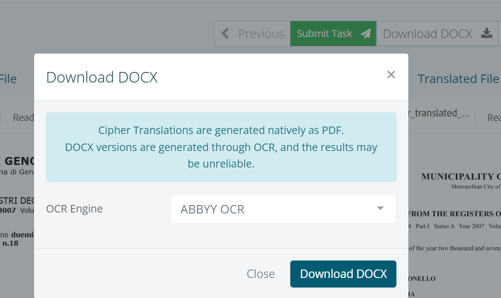 Cipher is Translayte’s AI-powered translation engine that generates instant pre-translations. It combines AI speed with expert human review steps to ensure accuracy, reduce turnaround times and deliver certified translations that meet client expectations.