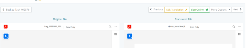 - Open the pre-translated document to access the compare screen mode and review document for accuracy.